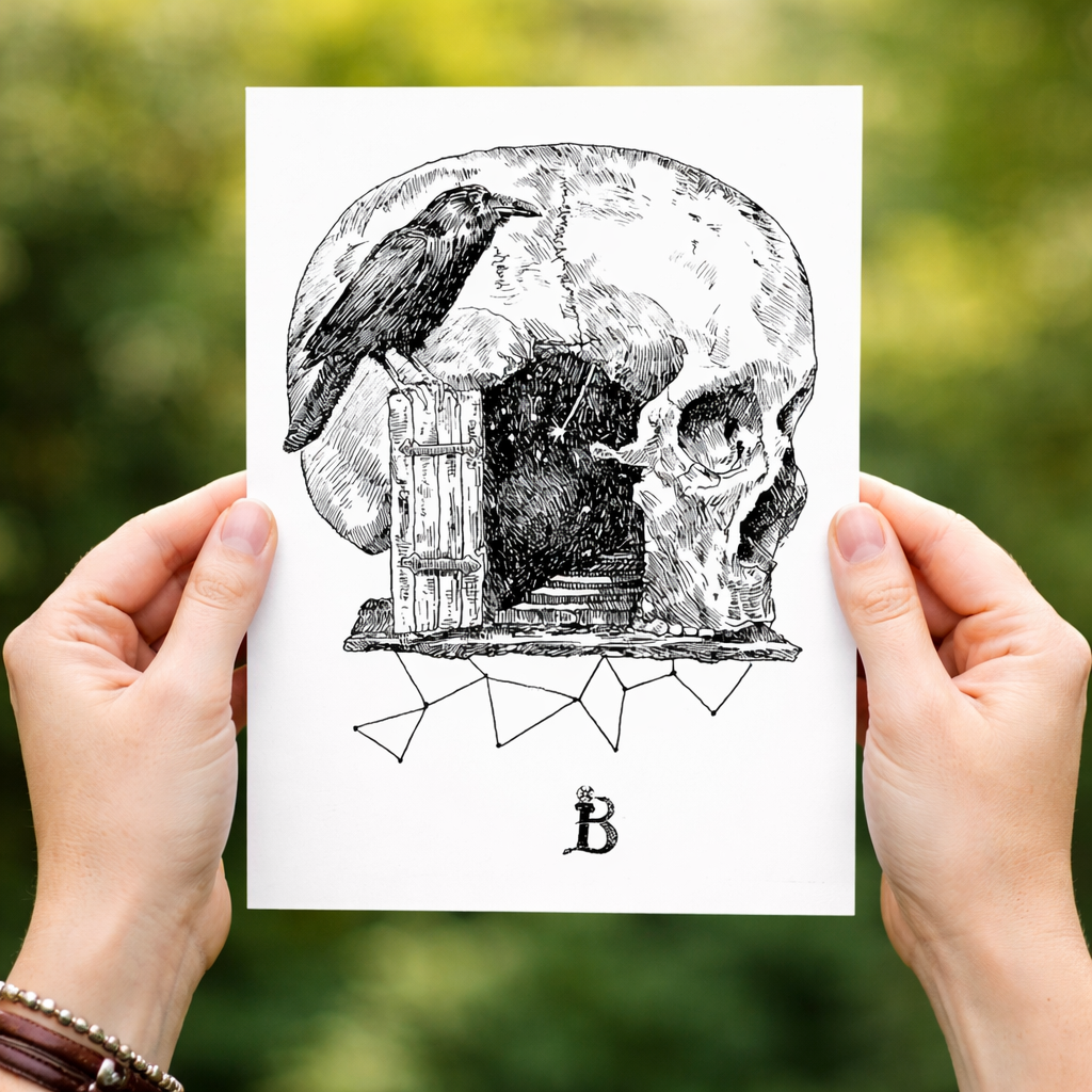 Desenul valorifică expresivitatea liniei, finețea hașurii și contrastul alb-negru, trimițând vizual către gravura clasică și ilustrația simbolistă. Este o lucrare cu caracter contemplativ, potrivită pentru colecționari de grafică, iubitori de artă simbolică sau pentru un interior cu identitate vizuală puternică.